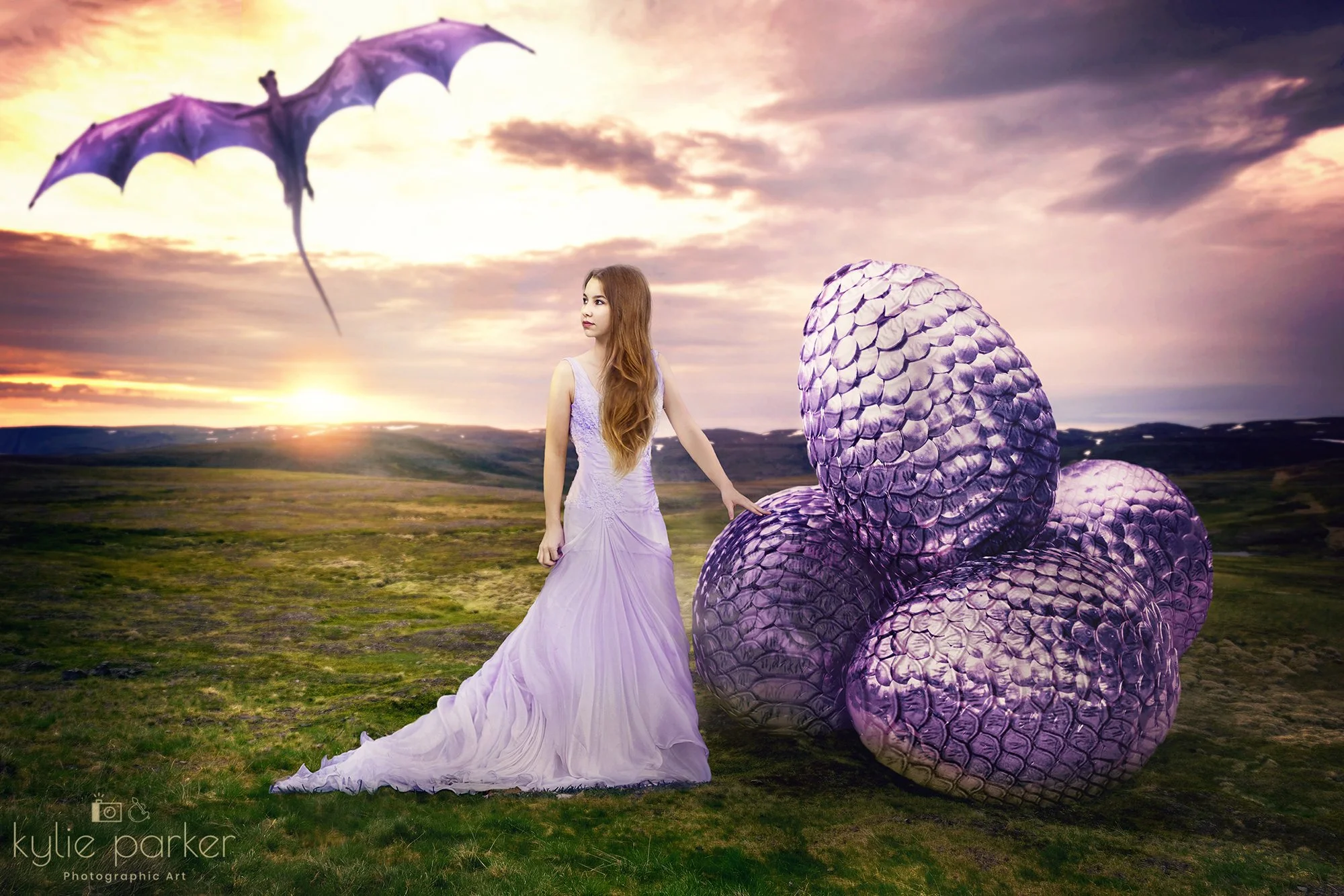 Set beneath a sunset sky, this portrait captures a moment of sacred responsibility. The dragon has departed, her eggs rest close at hand.